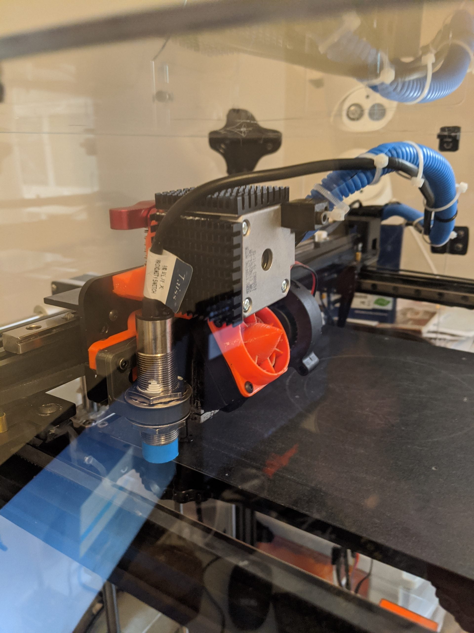 You will also need to move your wiring tie-down mount on the X axis cover. From the right-hand side like shown in the installation, to the back side of the cover. This change will get the wiring out of the path of the door hinge bolts and nuts. Eliminating the change of hanging up on the door hardware. I also decided to place an extra zip-tie here to keep them pulled away from the edge.