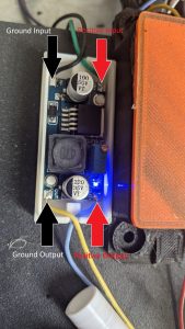 Now you should route your new power wiring out the hole in the frame, and attach the other ends to your LM2596 buck converter. We will then use the screw terminals or solder pads to attach our power leads to the converter. The red lead will go to your positive IN, and the black lead should go to ground IN. I opted for the solder pads, and made my input connections first.